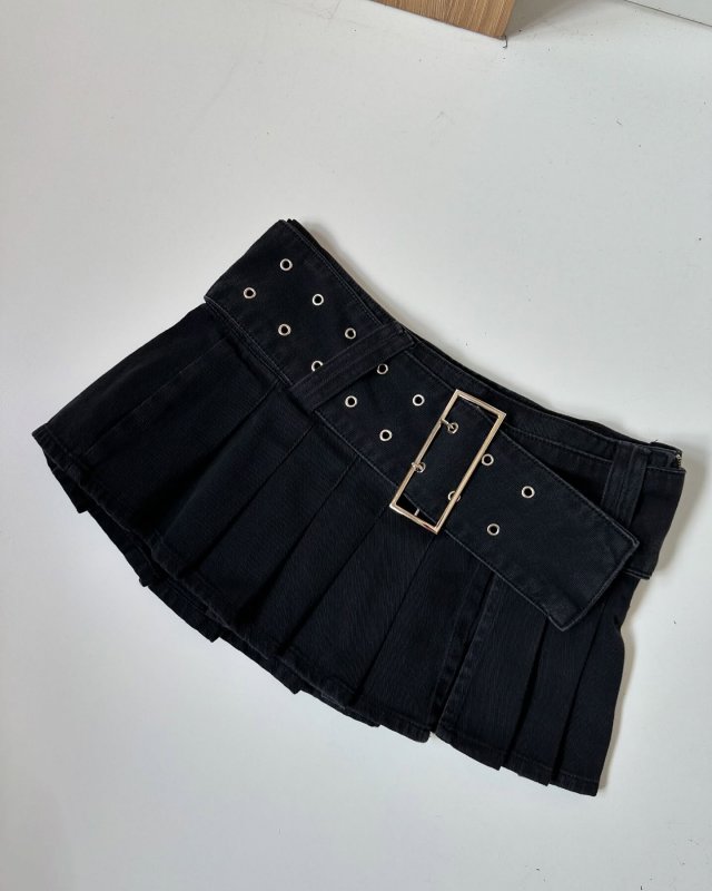 A saia tem corte plissado com caimento estruturado e vem com cinto grosso fixo, cheio de ilhós, que já dá o toque estiloso no visual. O tecido é jeans preto encorpado, firme no corpo e confortável ao mesmo tempo.