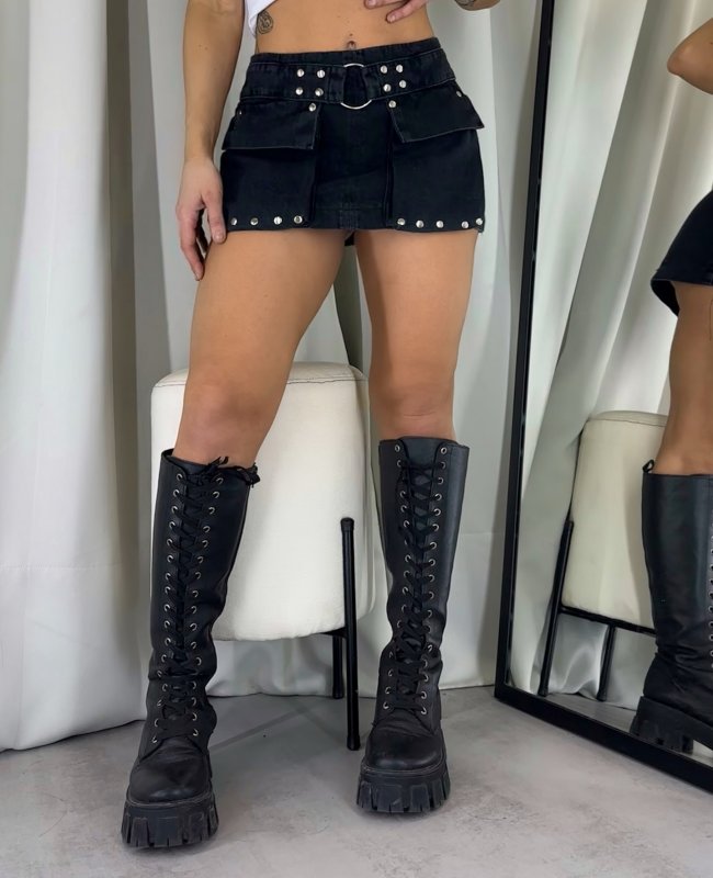 Com bolsos frontais estilo cargo, aplicação de tachas metálicas e um cinto com fivela que já vem junto, trazendo aquele visual street poderoso.