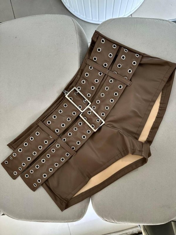 Peça chave que rouba a cena. O couro sintético dá o brilho, o cinto duplo com ilhós entra como assinatura. Estrutura firme, caimento justo.