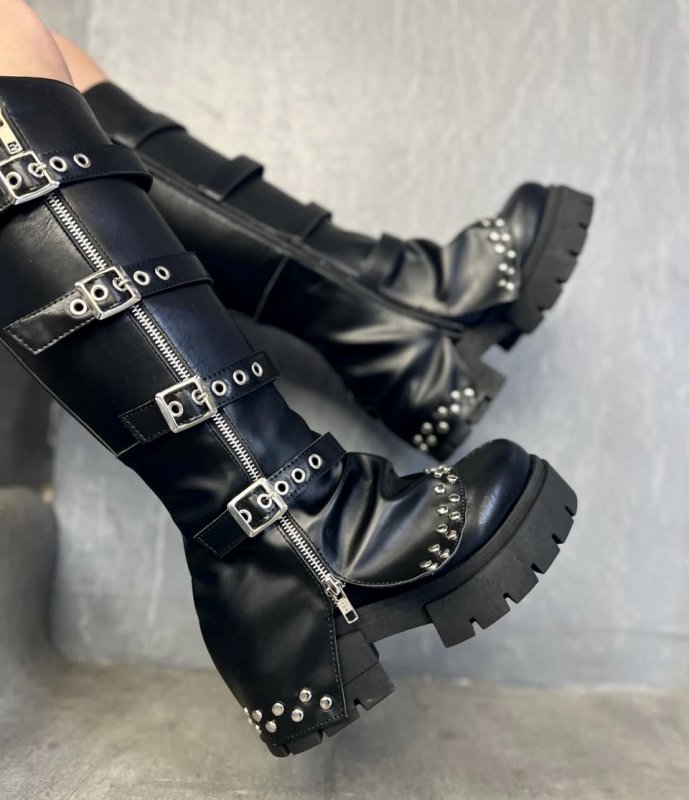 Essa bota traz um design marcante com cano alto, fechamento frontal em zíper, tiras com fivelas ajustáveis e aplicação de tachinhas metálicas que dão o toque final cheio de personalidade. O solado tratorado garante firmeza e conforto, além de ser super tendência.