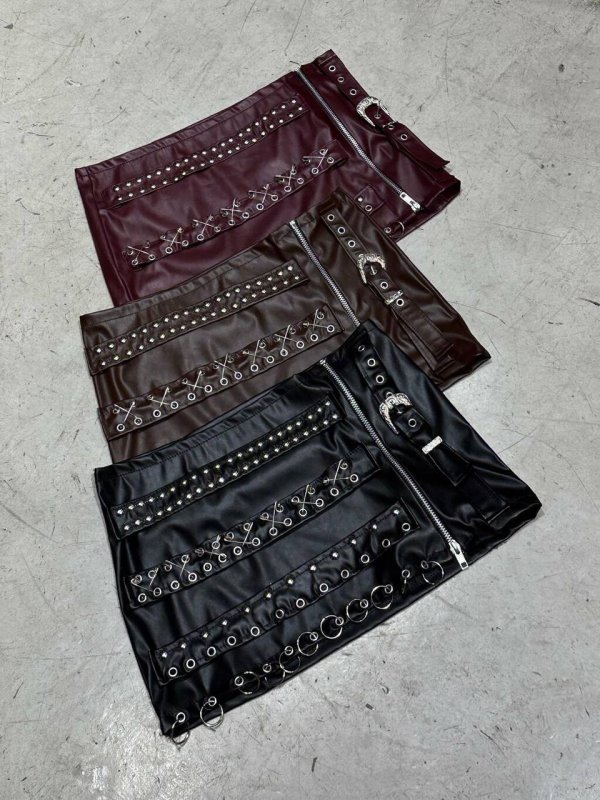 Essa saia grita rebeldia com detalhe, cheia de personalidade. Ela mistura elementos de estética punk com acabamento refinado: zíper aparente, cinto western, tiras com ilhós, argolas e spikes