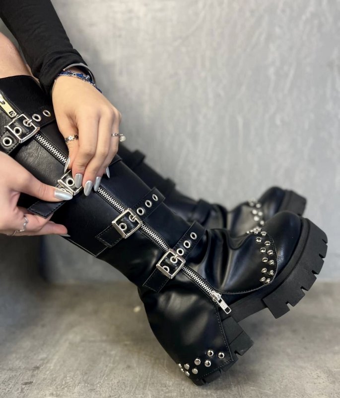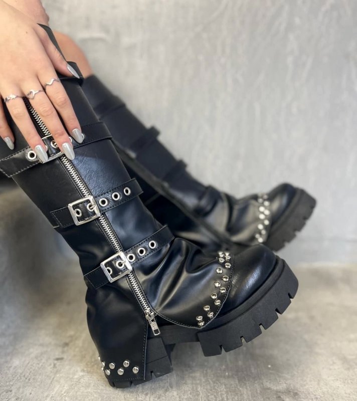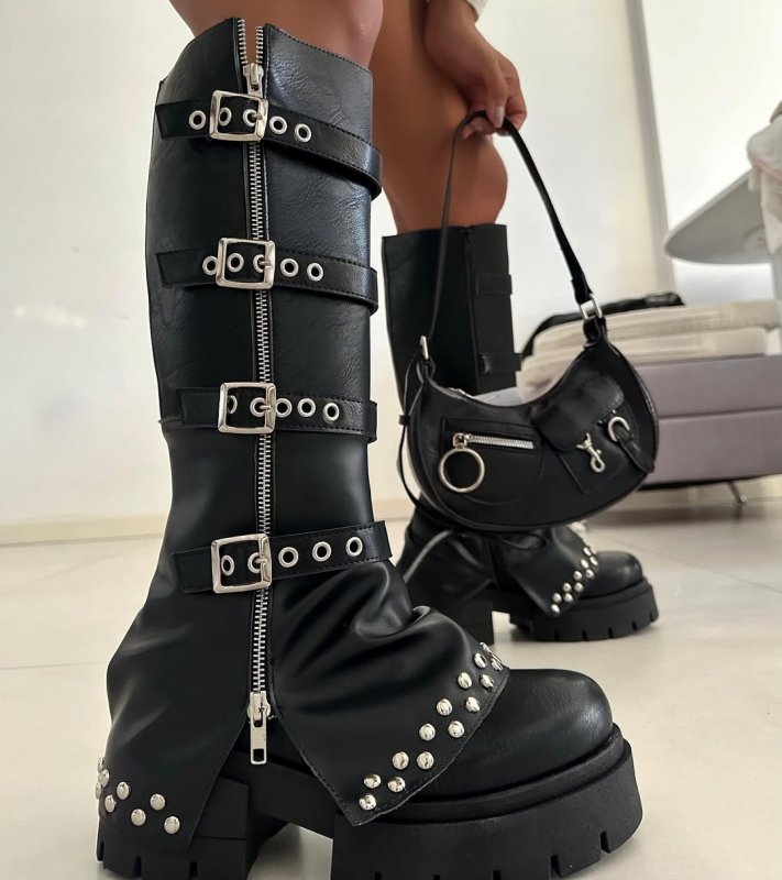 Essa bota traz um design marcante com cano alto, fechamento frontal em zíper, tiras com fivelas ajustáveis e aplicação de tachinhas metálicas que dão o toque final cheio de personalidade. O solado tratorado garante firmeza e conforto, além de ser super tendência.